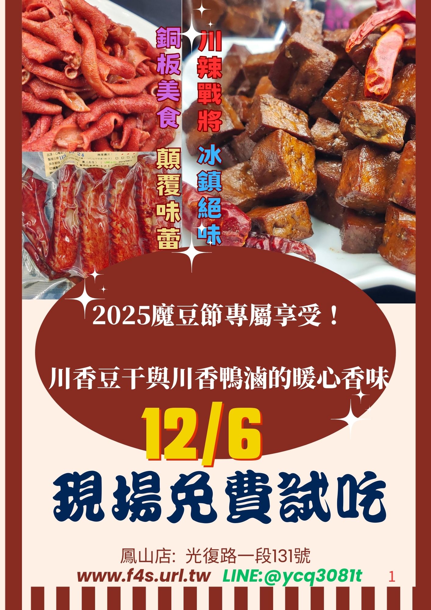川辣戰將出征了!! 20251206(六) 魔豆傳奇彩繪稻田 ~~ ....... 川辣戰將出征了!! #2025魔豆傳奇 活動日期|12月6日(星期六) 活動時間|上午10:00~下午2:00 活動地點|#南州運動公園 ( #彩繪稻田 旁) 屏東崁頂農場52區/南州鄉勝利路110號 香辣攤號 : #38 川辣戰將香滷店現場免費活動很多,美景+美食+好康不斷,歡迎寶饕們一起共襄盛舉!! 寶島四季美食開幕好禮三重送 #寶島四季美食開幕了!! 【川辣戰將 冰鎮絕味】 歡迎光臨挑戰鴨滷新派別、新吃法,冰的滷味顛覆您的味蕾~~ 開幕好禮三重送(限實體店面): 11.01~11.11 15:00~21:00 *來店禮 免費招待試吃 - 川香豆干 、川香鴨掌乙支 *滿百禮 消費金額滿$200元 送 川香鴨鴨翅乙支 *買五送一 同價位不同品項可任選五包送一包